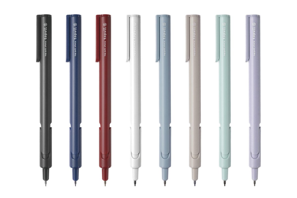 過去には、軸側面にノックボタンを付けたサイドノック式や、軸を中程から少し折り曲げるボディノック式など、いろいろなノック方式のシャープが存在した。ただ、機構的にトラブルが起きやすかったり、コストが高い割にあまり売れなかったり……などの問題から、現在ではそのほとんどが廃番となっているのである。そんななかで、久々に登場した“変態ノック機構”のシャープとして注目されているのが、サンスター文具の「トプルS」だ。