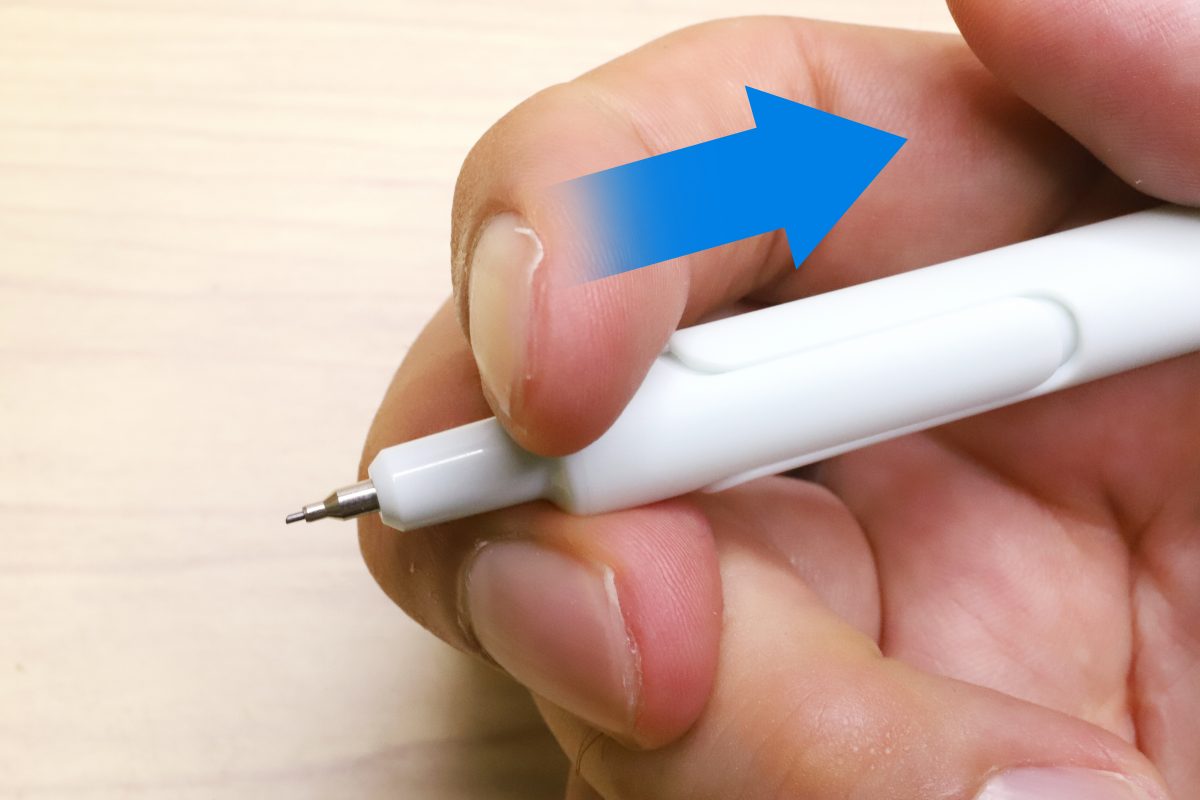 ノックする際には、まず先端の細軸・軸の段差に人差し指と中指をかける。指をかけるときは、第一関節に近いあたりをひっかけるようにすると、やりやすいだろう。あとはそのまま手を握り込むようにして引き込むと、前軸の分割線のところから押し込まれて、カチッとノックされるという仕組みだ。これがサンスター文具独自の、先端を引き込んでノックする「トッププル機構」である。