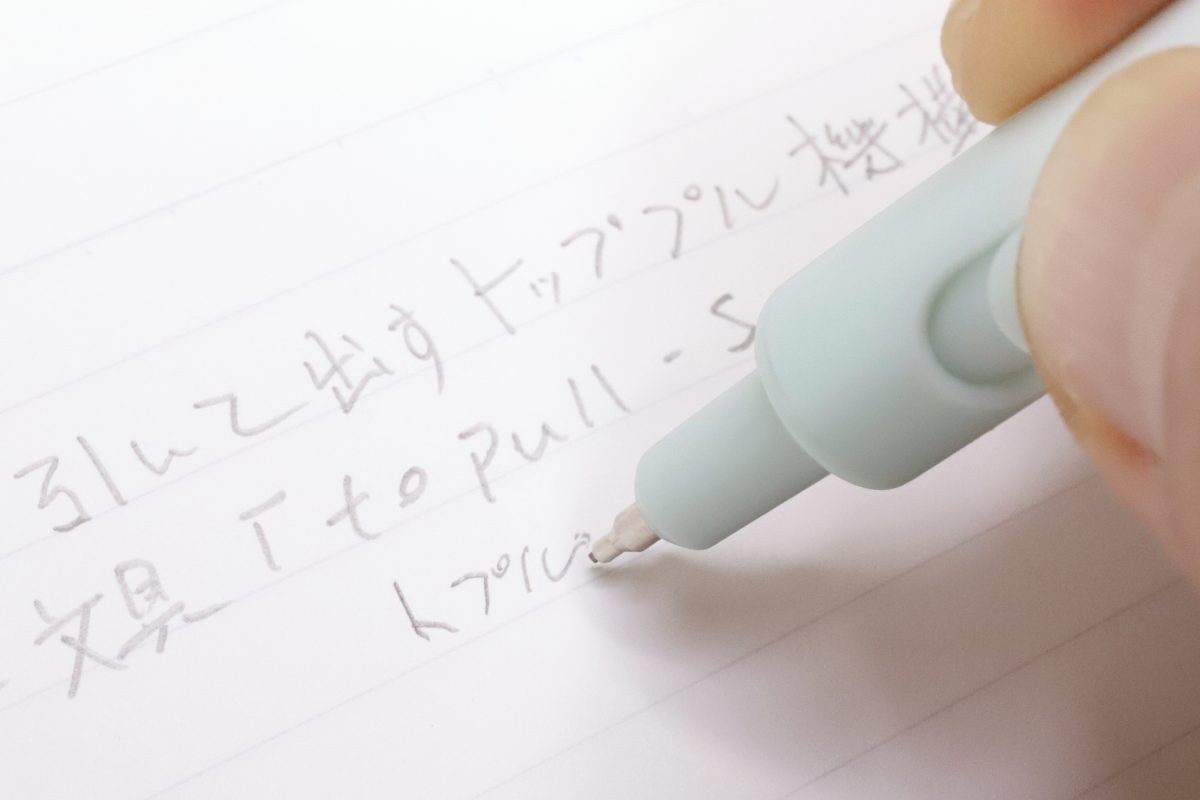 実際に試してみて感じたのは、まず先端視界の良さだ。トッププル機構のため、軸先に段差がついて細くなっている分、通常のコーンタイプの口金よりもペン先周辺が見やすい。重心は高めだが、トッププル用の分割線に指が掛からないようにすると、自動的に軸のやや上めを握る姿勢になるので、さほど気にならなかった。