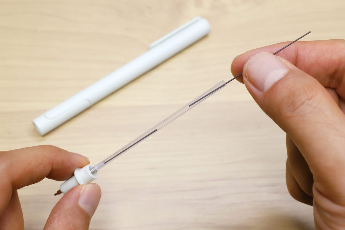 ちなみに芯の補充は、細軸をつまんでひねって軸から分離し、シャープリフィルを抜き出して行う。リフィル自体がかなり細いので、芯は2〜3本でいっぱい。誤動作防止のためには、入れておく芯は無理せず2本で止めておくのが良さそうだ。