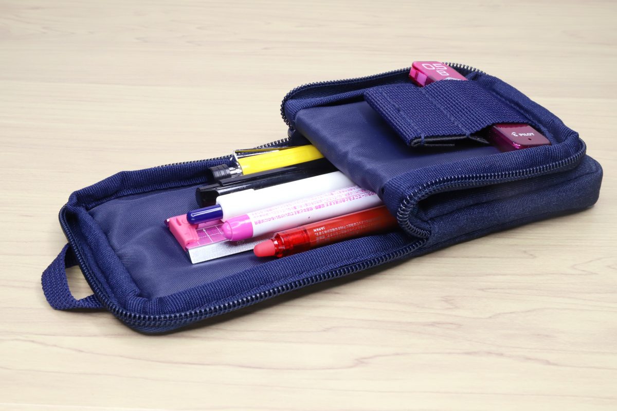 薄いだけあって、収納力はペンが横一列+定規のような薄物が入っていっぱい、ぐらい。使用感は、ペン5本と定規を入れて少し余裕があるぐらいがジャストの印象だ。縦型ポーチ形状なので、消しゴムやシャー芯といった小物類は、底に沈まないように専用スペースに通しておくと使いやすい。