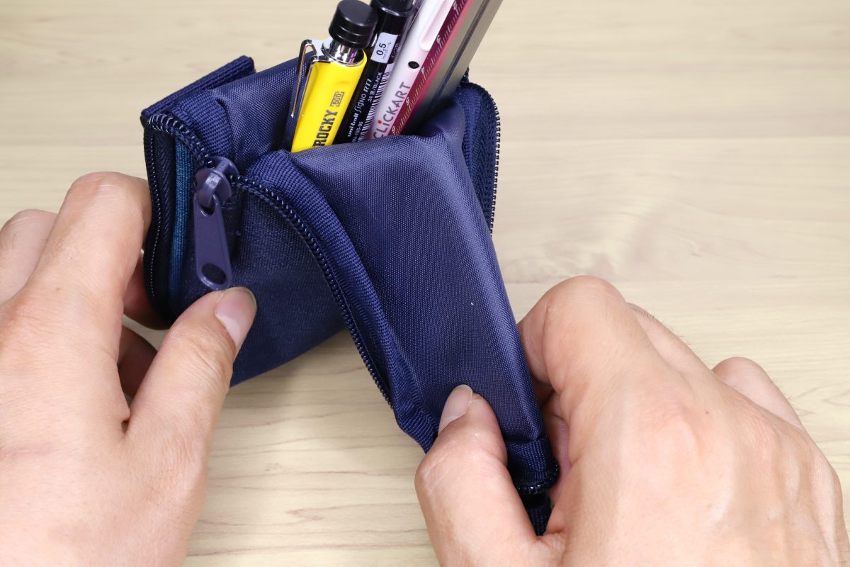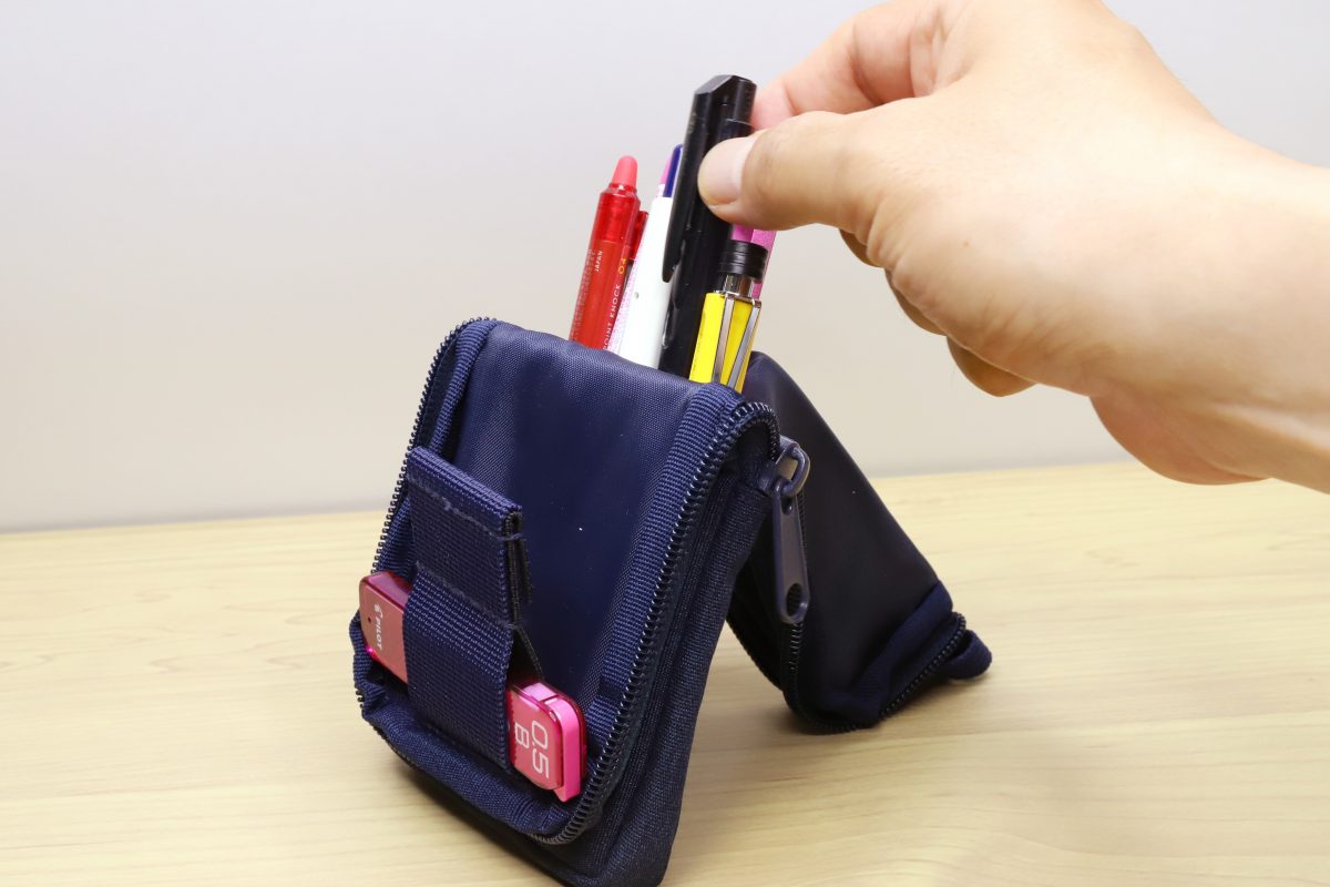 ここ数年の内に発売された機能性ペンケース(ペン立てやトレーに変形するなどの機能を持つもの)は、学生を想定して作られているのか、容量が筆記具10本以上という大ぶりなものが多かった。ラインマーカーやカラーペンを大量に携行する学生にはそれが正解なのだろうが、筆記具が数本で事足りる社会人にとっては明らかなオーバースペックと言えるだろう。