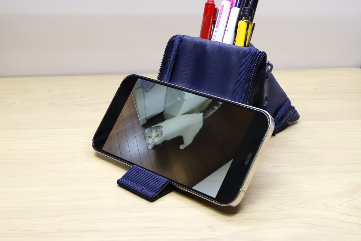 自立中に小物スペースを引き出してスマホを乗せると、スマホスタンドにも早変わり。作業しながらビデオ会議に参加したり、休憩中に動画を観たりするときなど、これもわりと「あると嬉しい」系の機能だと思う。