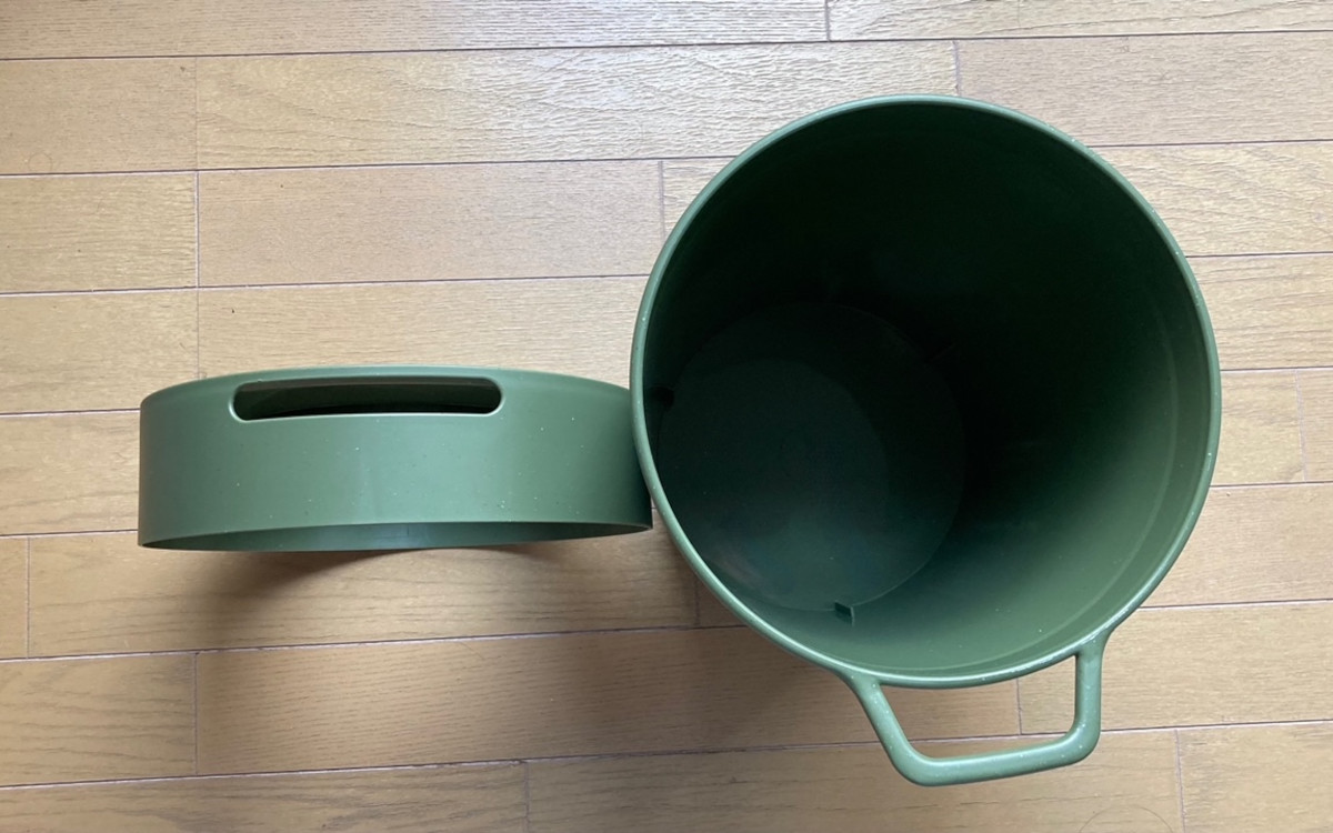こちらの商品はフタと本体が取り外し可能。フタを開けて袋を引っ掛けたら、穴の開いている部分を取っ手に通してはめなおします。