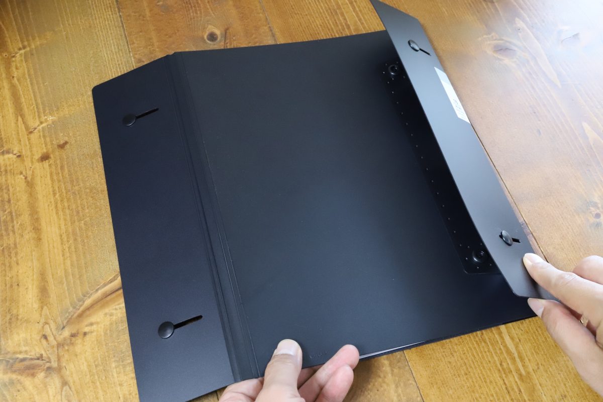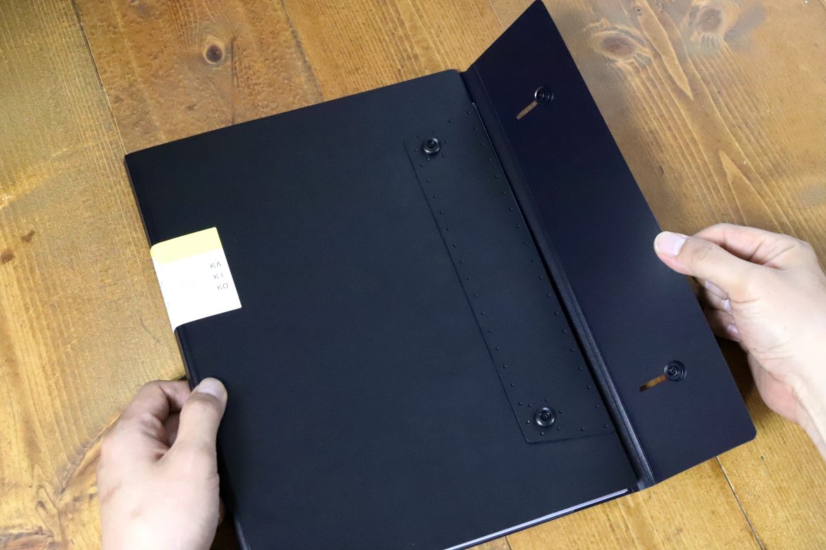 ジャバラポケットは裏面にもフラップがついているので、単純に表裏を逆にすれば倍のページが使用できる。裏ページ面に綴じた書類を閲覧するときは、裏表紙側のスナップボタンだけをはずして開くことで、表紙側と同じようにめくっていける。