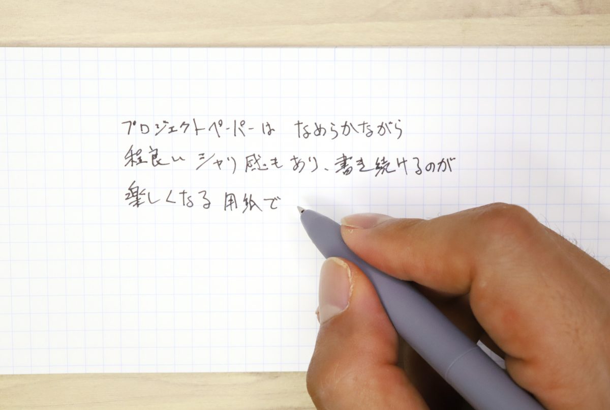 とはいえ、これだけ横長アスペクト比の紙面に横書きすると、どうしても長さを持て余しがち。なので、適度なところを線で区切って分割すれば、グンと使いやすくなるはず。細長ノートで一般的なA4ハーフだとまだ広すぎると感じることもあるので、それより一回りコンパクトなB5ハーフのレポートパッドは、かなり程よい印象だ。