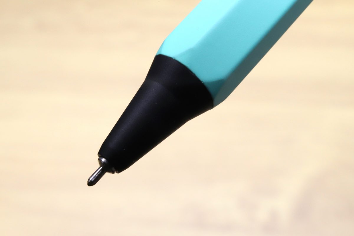 先端の口金が途中から細くなる形状も、なかなかに面白い。ペン先の視界が良いニードルチップだが、その手前の口金が太いと、ちょっと効果が薄れてしまう。そこで口金の三角錐を一段絞り込むように削ることで、先端視界(筆記時におけるペン先周りの見晴らし)を少しでもスッキリさせようという試みなのかもしれない。実際、書きやすさの点ではしっかり効果が出ているように感じた。