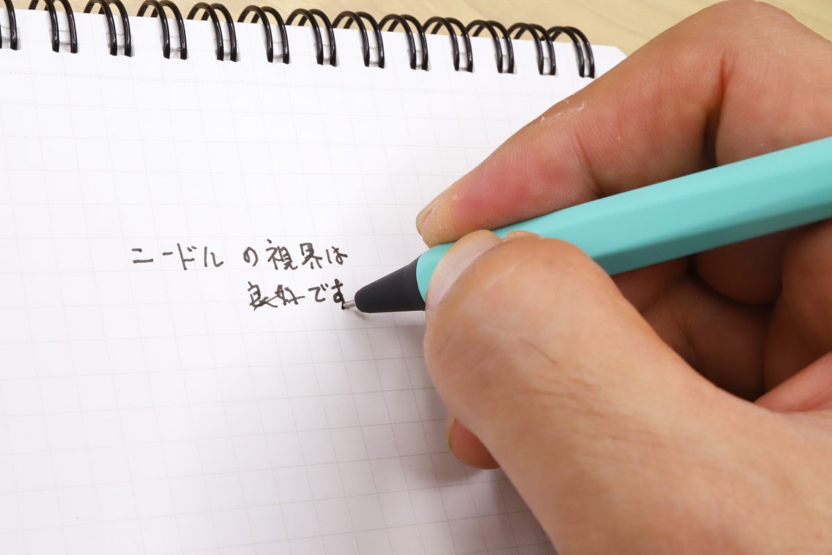 おかげで書き味は非常になめらかで、最近のつゆだく系ゲルの中でもちょっと類を見ないレベルと言えそう。しかもニードルチップの先端をなめらかに削り込んであるから、かなり寝かせ気味に書いても紙への引っかかりが発生しない。どこまでいっても徹底的になめらか、というピーキーさなのである。