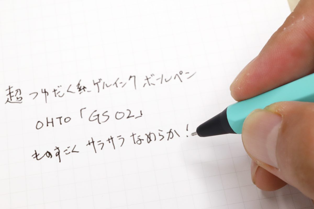 GS02でなによりすごいのが、筆記時の “つゆだく” っぷりである。OHTO独自のセラミックボールを搭載したペン先を紙に乗せて少し動かすと、もうそれだけで、ジュワーッと大量のインクが広がっていくのが分かるほど。場合によっては裏抜けしかねないほどのインク量だが、デメリットというわけではない。このように、インクが紙に素早く染み込むことで速乾性を担保しているようだ。