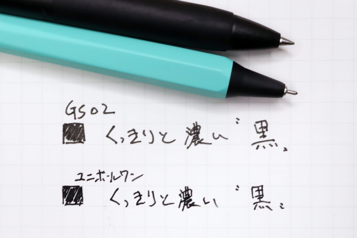 もうひとつのキーワードである「濃い黒」に関しては、正直なところ、ゲルインク最黒と言われる「ユニボールワン」「エナージェル」の二大製品と比較すると、わずかにアッサリして感じられるかも。とはいえそれは、あくまでも並べて見てのことであって、普通に単体で書いている限りこの黒さに不満を感じる人はまずいないと思う。