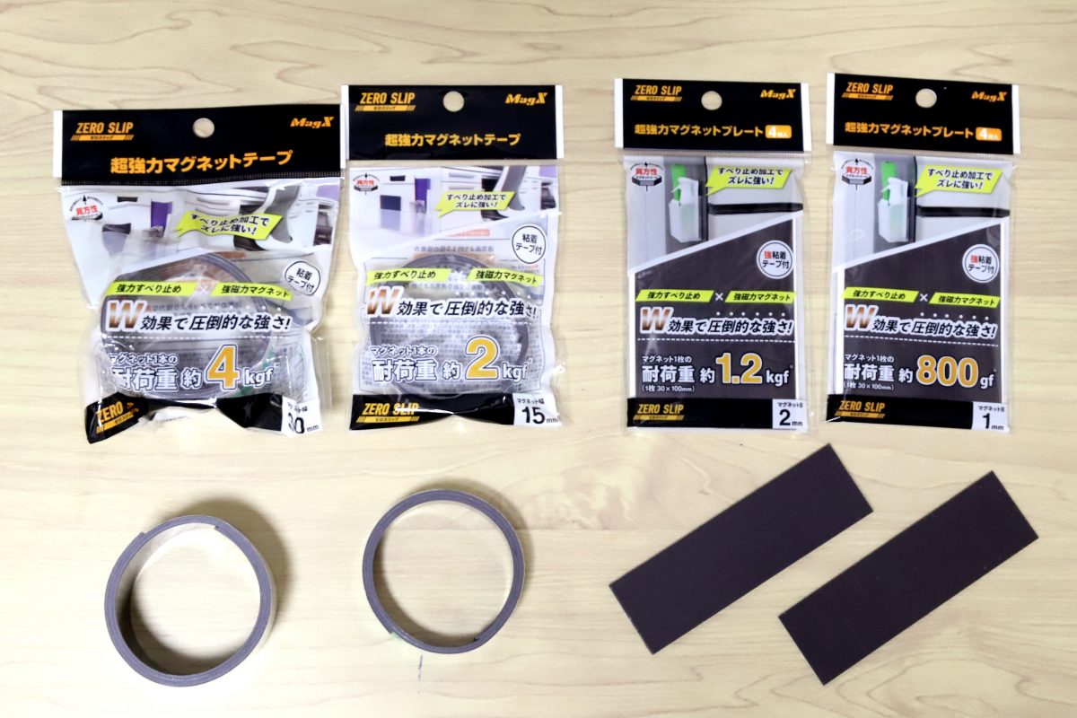 ラインナップは、面積が大きめのシートタイプ、貼りやすいテープタイプ、ピンポイントに貼れる小さなプレートタイプの3種類。いずれも表面がマグネットシート、裏面が粘着テープ付きという仕様で、プレートタイプのみ裏面が強粘着テープとなっている。