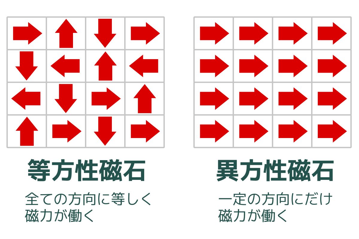 対して、異方性磁石は全ての極が一方向を向いているので、その向きにのみ強力に働くという性質を持つ。薄いマグネットシートなら等方性である必要はなく、面に対して極が揃った異方性の方がフルに磁力を発揮できる(約1.5倍)という理屈である。