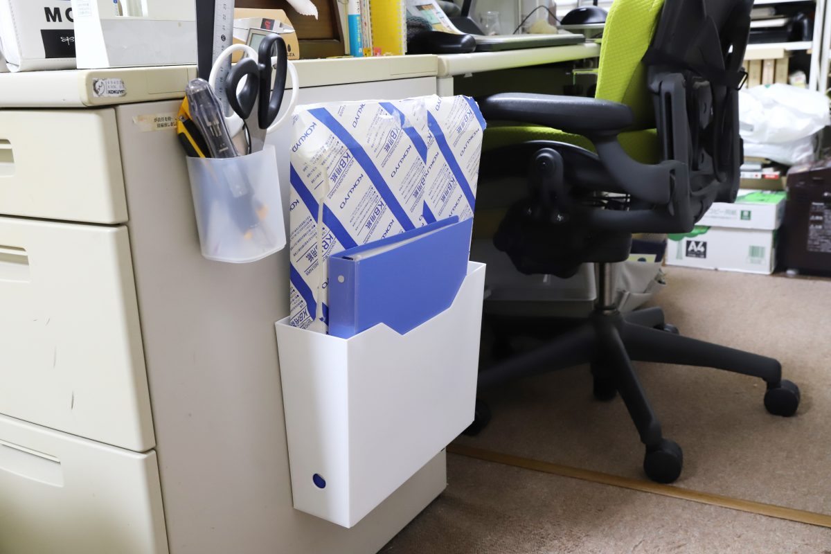 こういう場合の解決策としてまず挙げられるのが、いわゆる“浮かせる収納”。つまり、壁面から掛けたり吊り下げたりできる棚を使う収納方法だ。机などの二次元平面上に収納を設けられないなら、まだ余裕のある上方または下方の三次元空間上を使えばいいじゃない? という話である。例えば、磁石で収納ケースを貼り付けたりするのも、浮かせる収納方法のひとつだ。