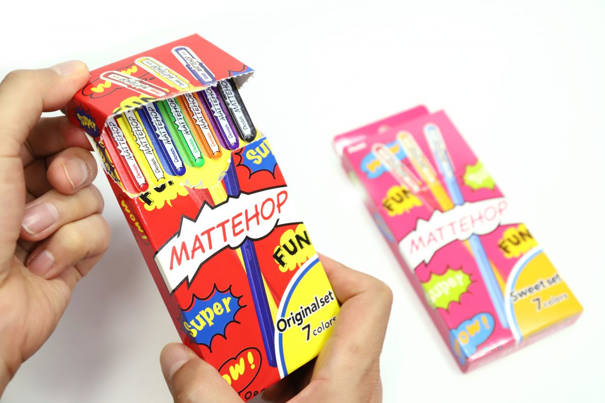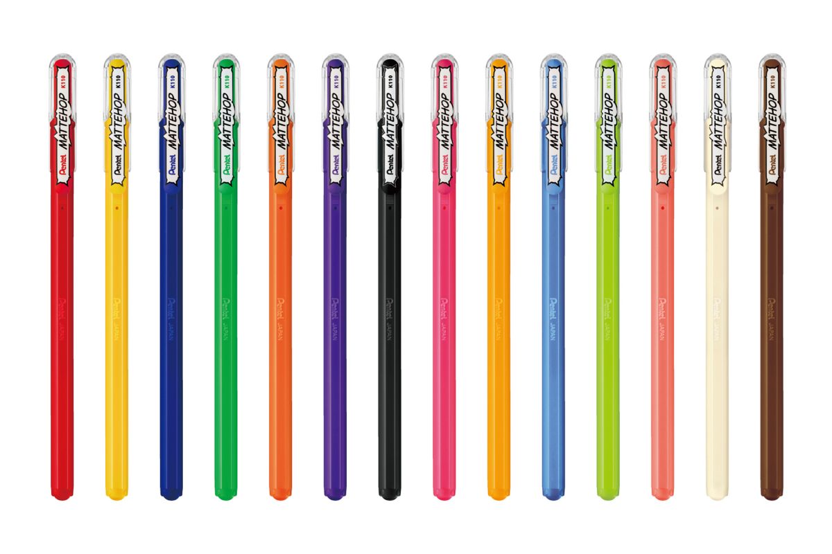 ぺんてるから発売された「MATTEHOP(マットホップ)」は、とにかくパキッと鮮やかでマットな発色に特化した、顔料ゲルインキボールペンである。ボール径は1.0mmでカラーラインナップは全14色。もちろん単色売りもあるが、原色系の「オリジナル」と、ちょい甘めな「スイート」の各7色セットがおすすめだ。なぜならパッケージがお菓子みたいでかわいいから。