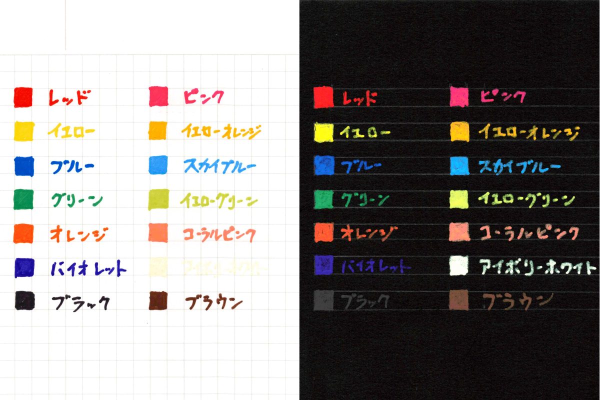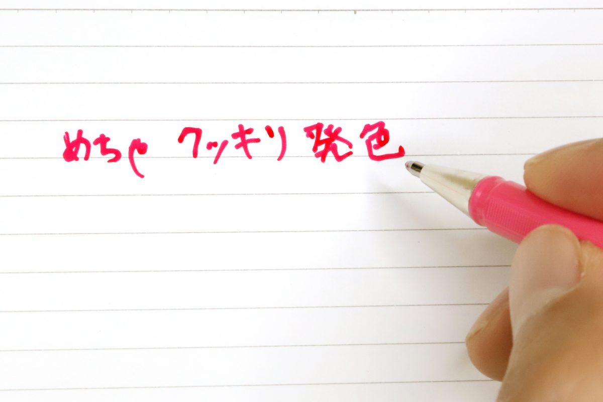 乾いた後の発色と塗り跡の雰囲気は、ガッシュ(不透明水彩絵具)のベタ塗りのような感じ。もしくは他社製品ではあるが、三菱鉛筆の「ポスカ」の筆跡が近いかもしれない。ポスカのあの発色がボールペンで書ける……と言うと、興味を惹かれる方はかなり多いのではないだろうか。