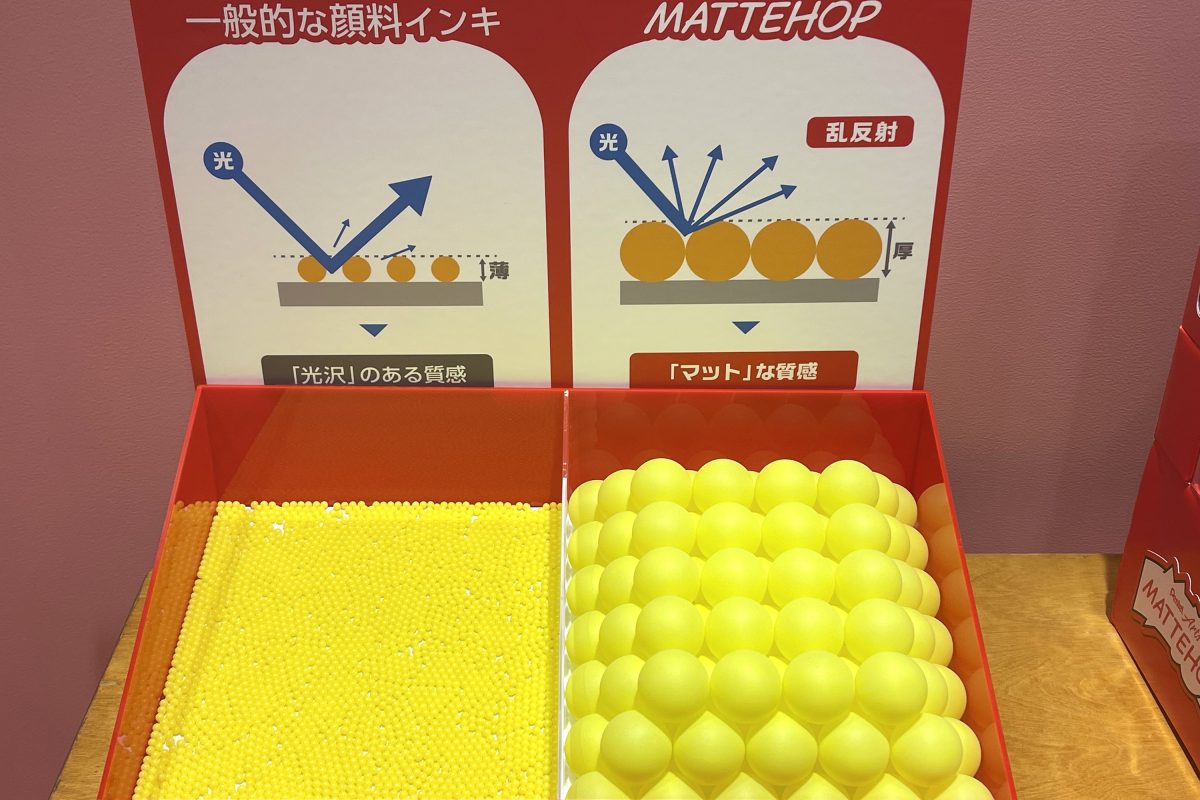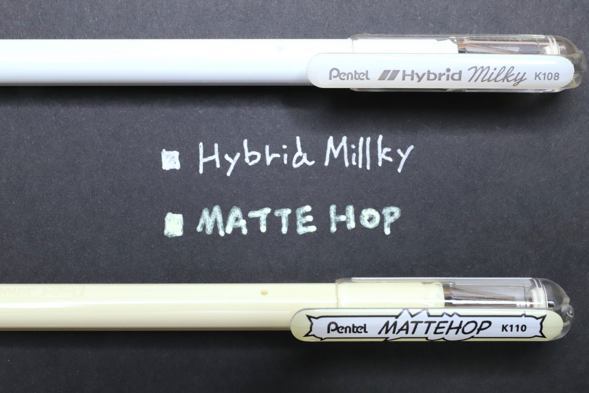 ハイブリッドミルキーのインクは、中に修正液の成分である酸化チタン(非常に隠ぺい力の強い、白の顔料)を含んだもの。これによって黒い紙でも美しく発色できるが、ラインナップは白っぽいパステル色に限られる。対して、マットホップはインク顔料の粒を巨大化させ、かつ高濃度に配合。大粒の顔料は光を強く乱反射させるので、光沢の少ないマットな発色ができる、という仕組みだ。顔料粒が隙間なく紙に乗るので、隠ぺい性も高い。