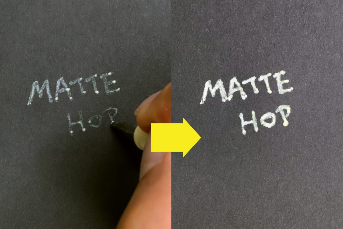 筆記性能としては、マットな発色に加えて高い隠ぺい性を持ち、黒い紙面やポラロイド写真にもクッキリ書けるというところが最大のポイントとなる。それだけを聞くと、1990年代のギャル文化で猛威をふるった、かの「ハイブリッドミルキー」直系の子孫! という印象を受けてしまうが、実はマットホップとハイブリッドミルキーの発色の仕組みはかなり違う。