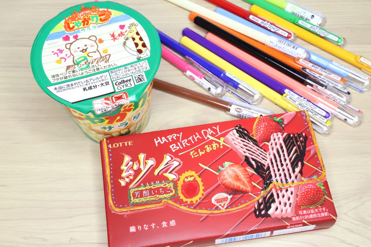 例えばJK文化のひとつであるお菓子パッケージへの落書きに使うと、光沢のある面にマットな筆跡がとても目立つため、いっぱい落書きしたぞ! という満足感が強く得られるはずだ。この辺りはさすが、落書き・デコ用ボールペンとして作られただけはある。ただし耐水性がほとんどなく、乾いたあとでも水に濡れると即にじむので、ドリンク類やアイスクリーム系のパッケージには使わない方が良さそう。