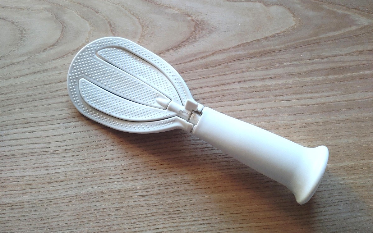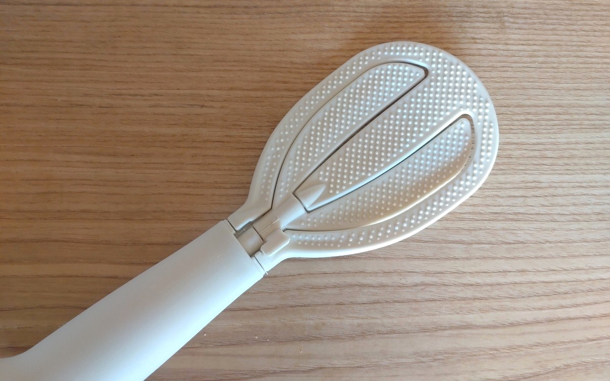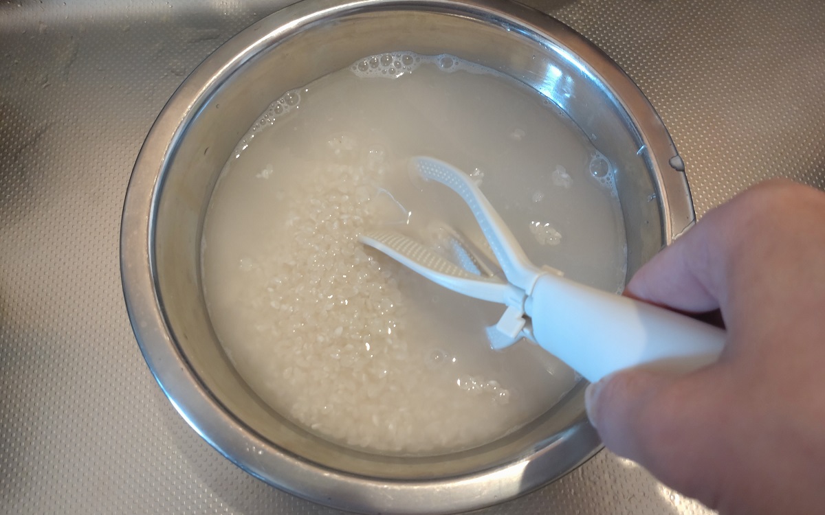 突起を左に倒すと、すくう部分の1部が回転。ホイッパーの様な、お米をとぐのに適した形になります。先端部分の横幅が約7.5cmとちょっと大きい印象でしたが、このギミックがあるからだったんですね。寒くなってくるとお米をとぐのが億劫だったので、かなり嬉しい機能でした。