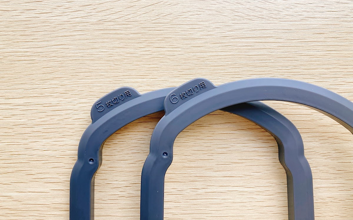 同商品は「5枚切り用枠」と「6枚切り用枠」がセットになっており、左上を見れば何枚用の枠かがわかるようになっていました。セット時のサイズは約15(縦)×20(横)×2cm(高さ)で、だいたい食パンと同じくらいの大きさです。