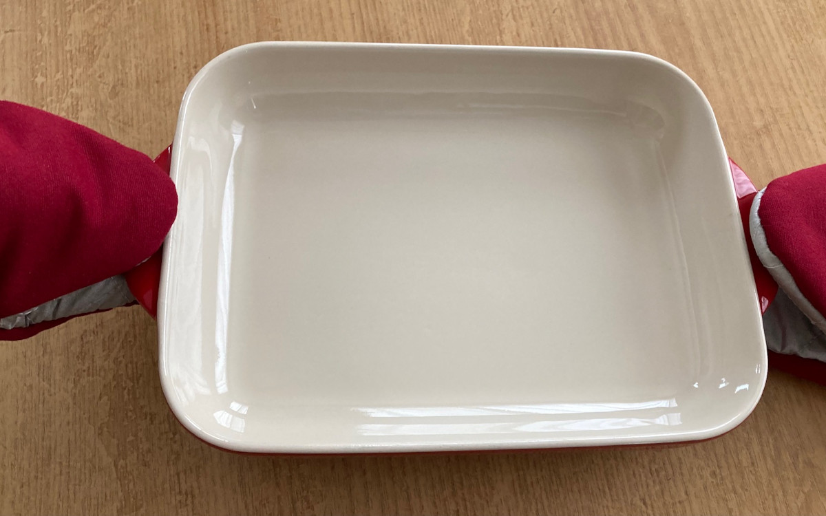 実際にグラタン皿を持ってみました。通常のミトンは内部に結構余裕があるため、お皿をしっかり持つ意識が必要です。しかしクイックミトンは手にフィットしているので、持ったときにお皿の感触がしっかりと伝わってきます。「お皿を落とすかも?」という不安があまり感じられませんでした。