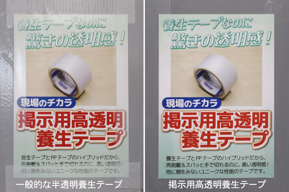 PPテープと同じポリプロピレンフィルムなら、なるほど、透明性が高いのは当然だ。掲示物のフチにぐるりと貼っても下の印刷部分がくっきりと見える。これは従来の養生テープでは不可能なことだったので、正直、かなり衝撃的な性能と言えそうだ。