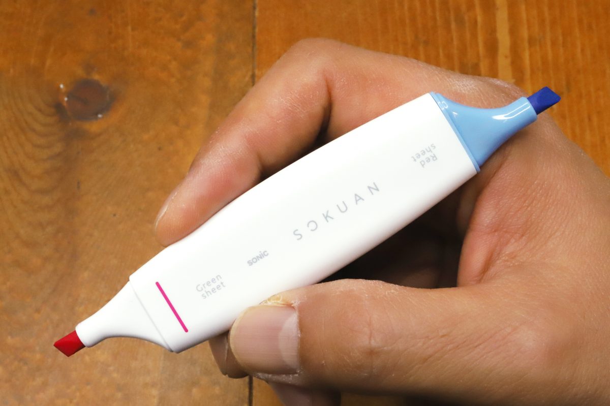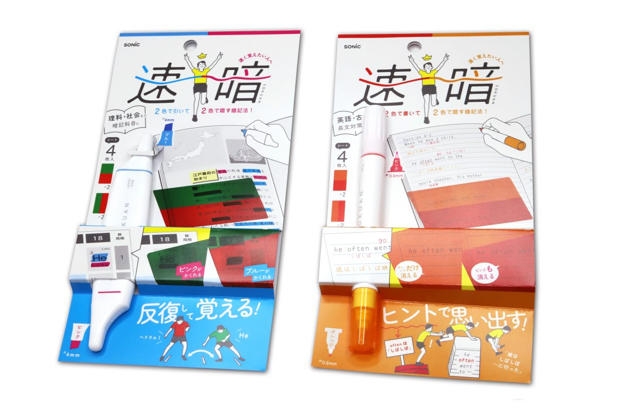 SONiCから発売された「速暗」シリーズは、「暗記ペン+暗記シート」学習の効率を高めて暗記スピードをアップさせるためのツールだ。ラインナップは2種類で、反復暗記に効く「赤/緑シート+ピンク/ブルーの2色マーカー」セットと、ヒントが出せる「オレンジ/ピンクシート+オレンジ/ピンク2色ペン」セットとなっている。どちらも2色ペンで書いて2色シートで隠す、という構成になっているが、その使い方と勉強の方向性がまったく別物なのが面白い。