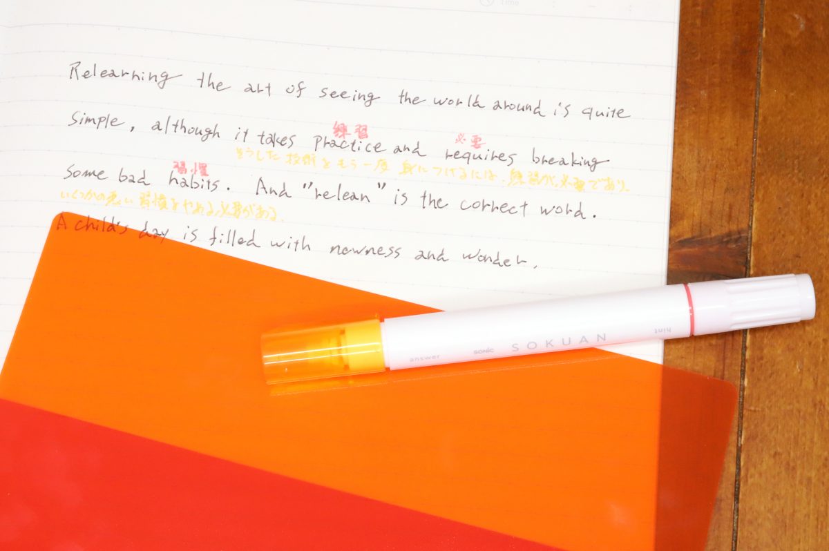 もう一方のオレンジ/ピンクシートセットは、文字を書く用に約0.6mm径のオレンジ/ピンクの中字ペンが同梱されている。こちらは、例えば英文の長文問題の中で、記憶が危うい・または難しい単語の訳をピンクで書き、さらに全体的な訳文をオレンジで書くのに使ってみよう。