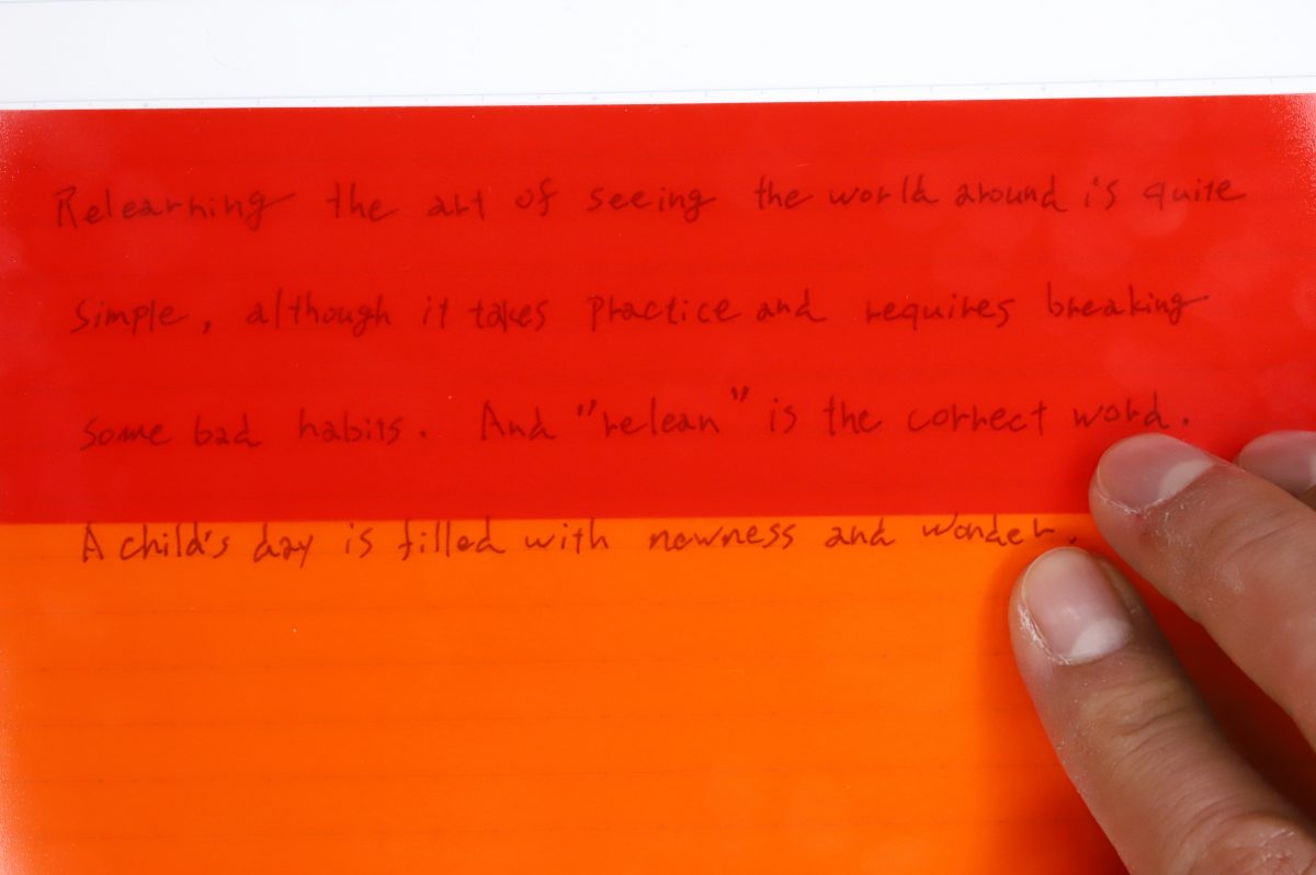 正味の話をすると、お馴染みの「マーカー+カラーシート暗記学習セット」から機能的になにかが変わっているわけではない。製品としてユニークなのは、 “2色のマーカーによる2通りの目隠しを使った、効率的な暗記学習法の提案” という部分なのである。