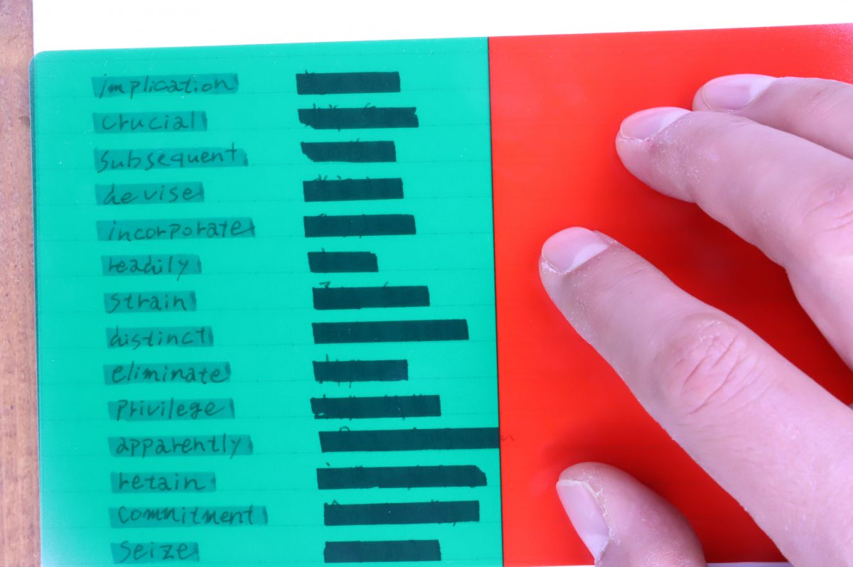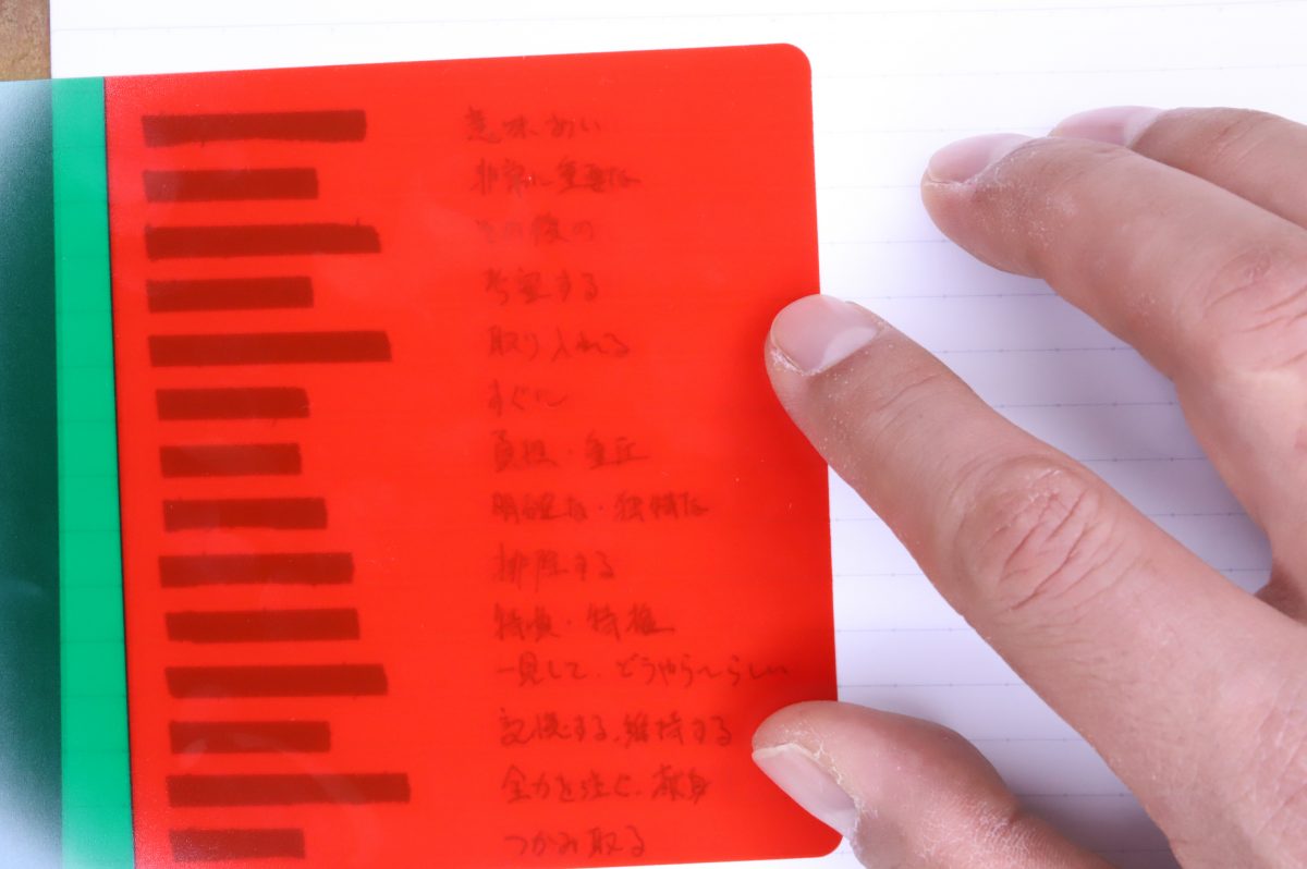 従来の暗記学習は、1ページ内のマーキング箇所(目隠し)が多すぎると文章が意味をなさなくなるし、難易度が高くなりすぎて学習効率が落ちる、というデメリットがあった。しかし、2色で交互にマーキングしておけば、1色のシートで隠れるワード数が従来の半分になるので、難易度は適度に調整される。さらに、緑シートで覚え終わったら次は赤シート、というようにすぐ問題を切り替えることもできるので、何度も反復しての暗記効率を上げることもできるという仕組みである。これは大量の暗記項目がある英語や古文、または理系科目に効きそうだ。