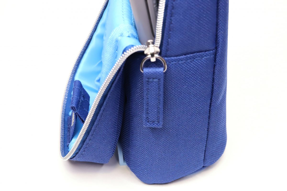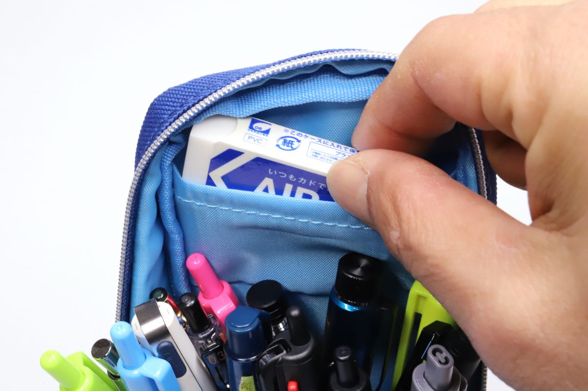 さらに、フタをガバッと開けて本体に押し付けると、内蔵のマグネットで開いたままで固定することも可能だ。これによって中身の出し入れはとてもスムーズ。閲覧性も高く、使いたいペンにサッと手が届くはずだ。ただし、ファスナーの開き具合によってはマグネットが上手く効かず、フタが戻ってしまうこともあった。磁力そのものはさほど強くはないので、開けっ放しにしたい場合はフタを本体にグッと押し付けるようにするのがコツだ。