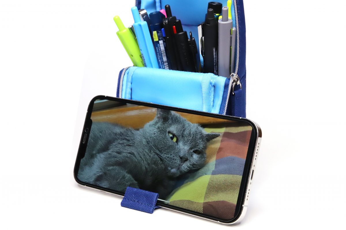 フタの端にあるベロにスマホを引っ掛けるようにして置くと、縦置き・横置きどちらでも安定して立たせられるスマホスタンドとしても機能する。狭い机の上が書類やノートPC、文房具などでゴチャゴチャしていると、スマホの置き場所に困ることもよくある。ゆえに、ペンケースにスマホスタンド機能があると、意外とありがたいのだ。もちろん、動画視聴やビデオ会議にも間違いなく重宝するだろう。
