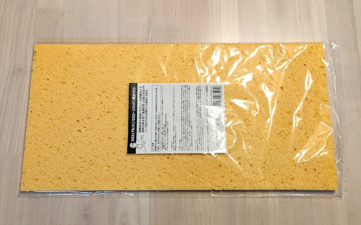 商品のサイズはおよそ縦23×横46cmで、スポンジのように穴がぼこぼこ開いています。注意書きにもあるとおり乾燥すると固く縮んで変形するため、使って乾かした後は最初のサイズよりも一回り小さくなりました。ただし少し水を含むとすぐに柔らかく膨らみます。
