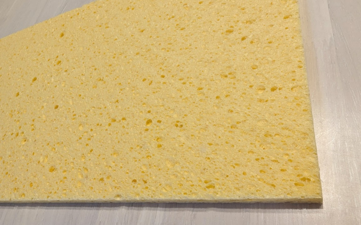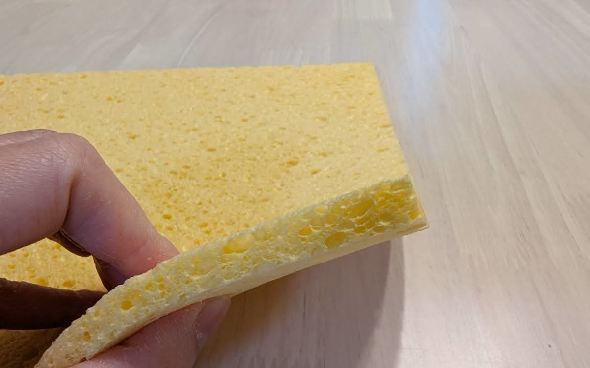 湿潤時の厚さはおよそ0.7cmで、横から見てもスポンジみたいな穴がたくさん。初めて使うときは2~3回水洗いしてから使用します。