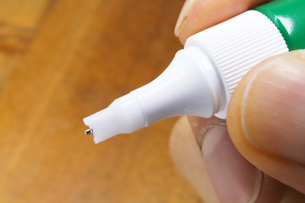 液が薄く広がるのに加えて、乾燥に要する時間も従来の半分と大幅に短縮されている。さすがに「塗ってすぐ」というレベルではないが、塗って、キャップを戻して、書き直しのためにボールペンに持ち替えて……ぐらいのタイミングでなら充分に乾いているはず。