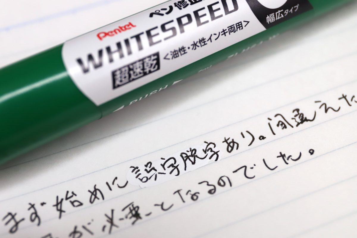 それに対して「修正テープと液のいいとこどり」を謳うのが、話題の新製品こと、ぺんてるの新型修正液「ホワイトスピード」である。つまり、乾燥が早くて、塗りむらができず、厚塗りにならずひび割れもせず、ペンタイプなのにテープのような幅を一気に塗ることができて、さらに修正テープには難しいこともこなしてしまう、というわけ。もしこれが本当だとしたら、修正液の復権も充分にあり得るのではないだろうか。