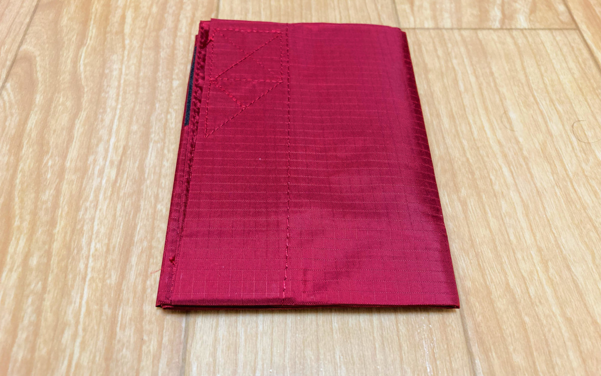 折りたたんだ状態のサイズは、約11.5(縦)×8(横)×0.5cm(厚さ)。素材はポリエステルです。ほつれにくく破れにくいリップストップ生地を採用しているので、軽量ながら耐久性も申し分ありません。