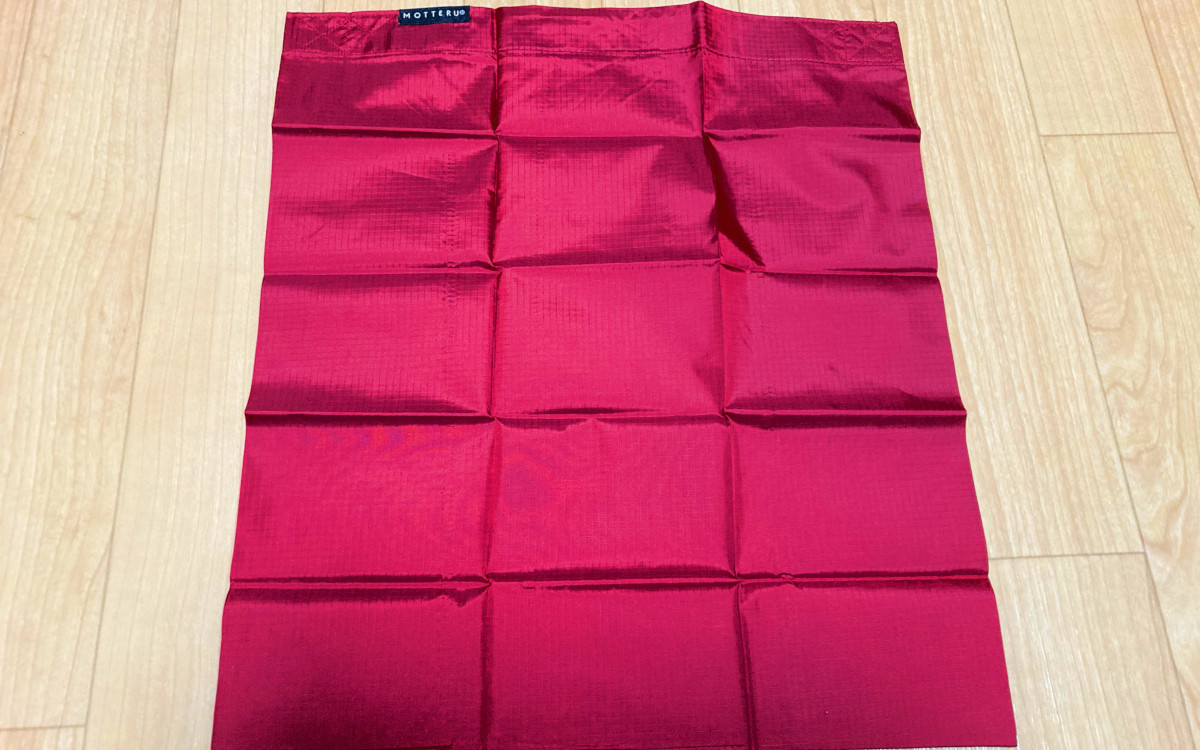 実際に広げたときのサイズは本体が約33(横)×37(縦)×18cm(幅)で、持ち手の部分が約3(幅)×21cm(長さ)です。たたんだ際の折り目にそってプリーツ加工が施されているため、バッグを広げた後も簡単に元の形に折りたたむことができました。