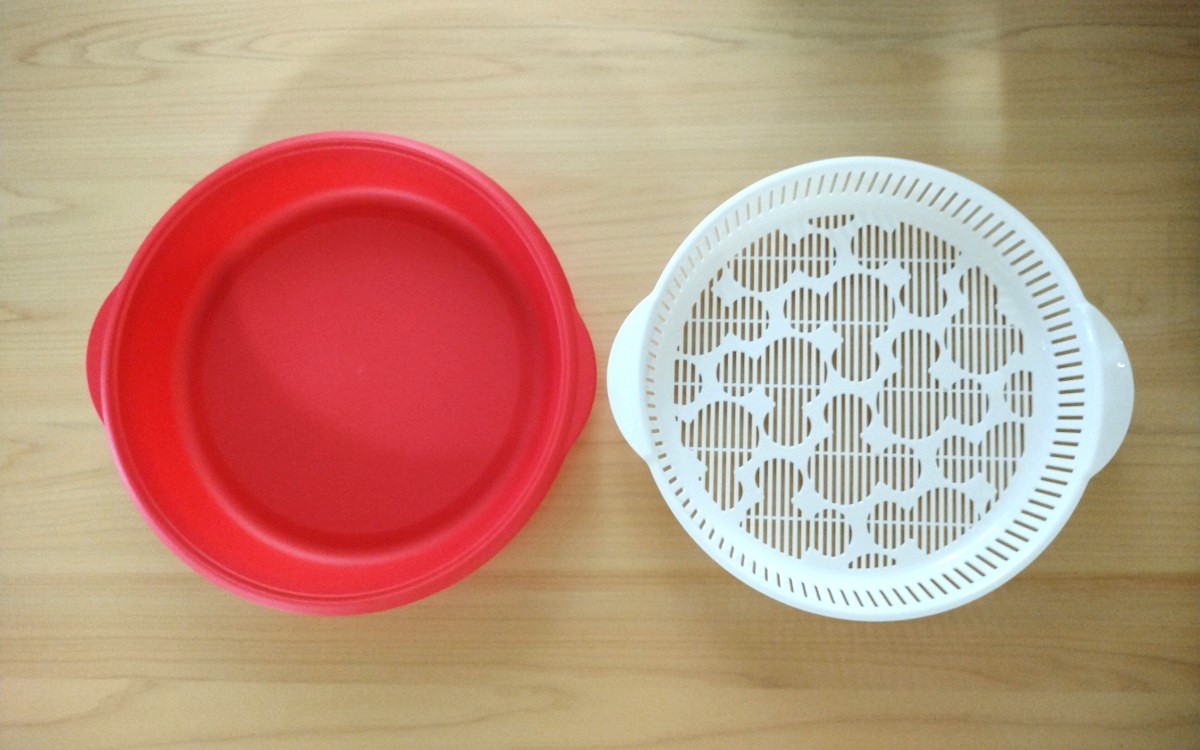 カラーはメッシュになったお皿がホワイト、受け皿の色がレッド、グレー、ピンクと3色展開しています。今回は鮮やかさが食卓に映えるレッドを選びました。