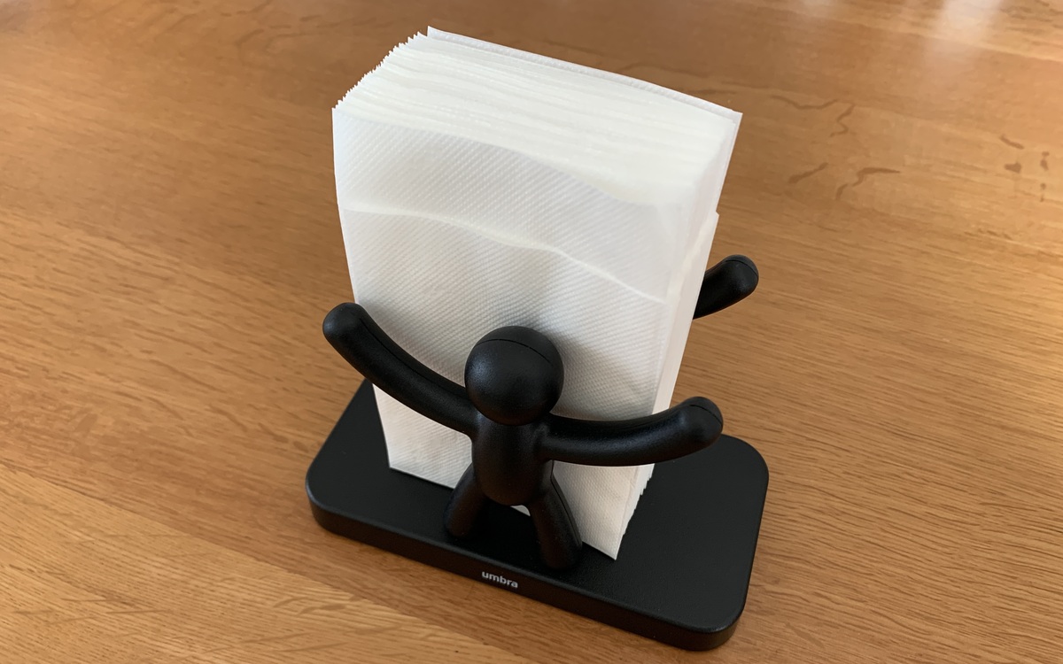 数あるナプキンホルダーの中からUmbraの商品を選んだのは、人型モチーフのキャラクターがナプキンを支えているような小気味よいデザインに心を奪われたから。また一見奇抜なデザインではあるものの、オールブラックのボディのおかげでインテリアに馴染みやすいのも決め手の1つでした。