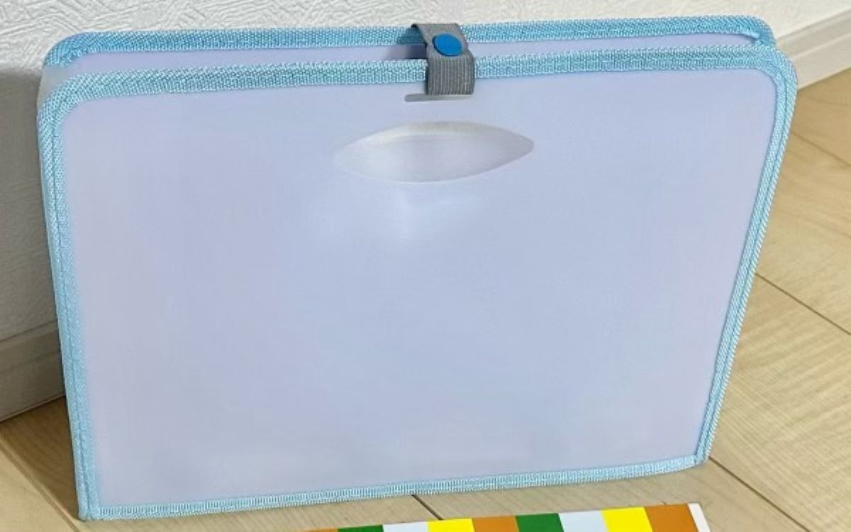 こちらの商品はA4サイズに対応しており、マチが最大約33cmまで広がります。マチを広げることで自立してくれるので、ブックエンドを用意したり、本棚に入れる必要がありません。ちなみに現在サイトで購入できるカラーはブラウン、クリヤー、ライトピンク、ブルーグレーの4色で、今回は爽やかなブルーグレーを注文しました。