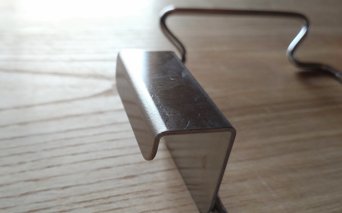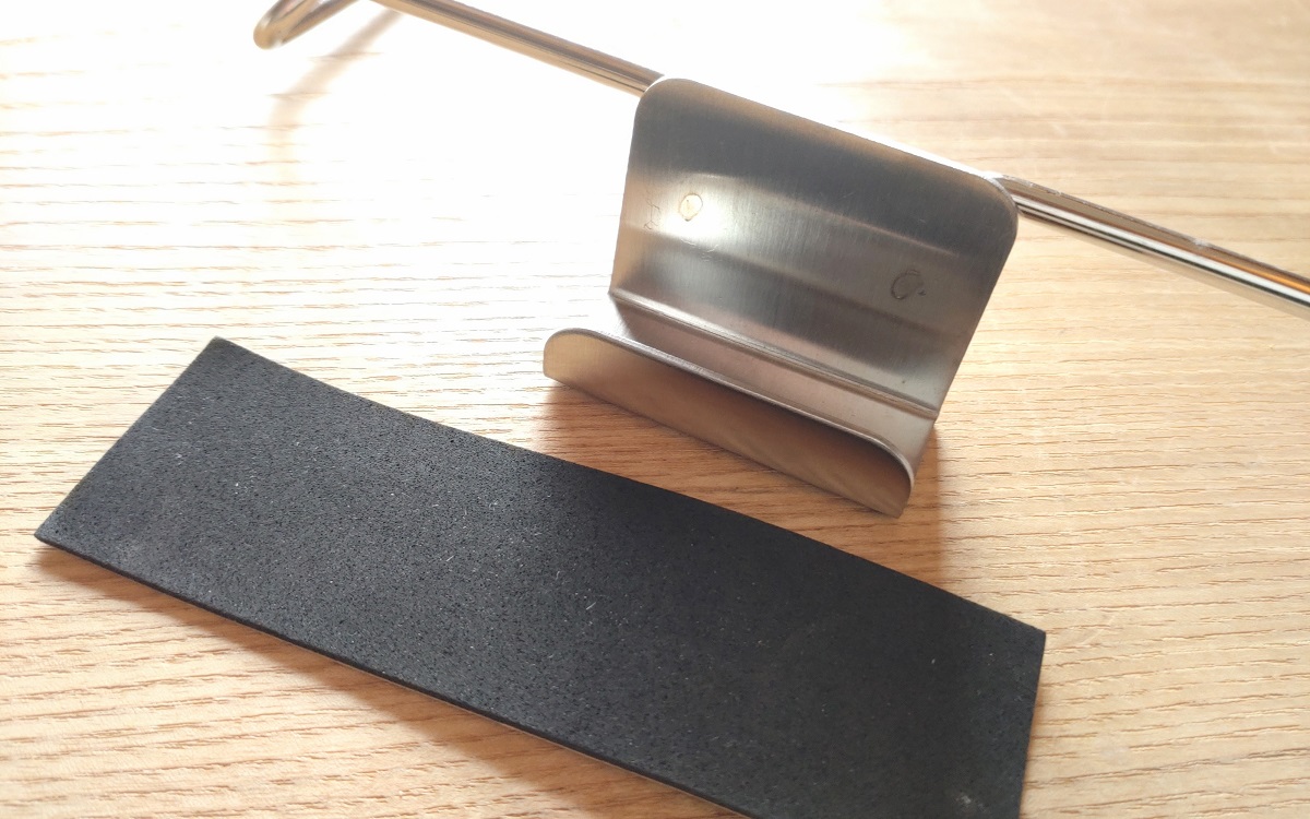 フックの部分もステンレス製。こちらもしっかりと厚みがあってグニャッと曲がってしまう心配はなさそう。ただ、頑丈な分、引っ掛けた際に扉や引き出しの表面が傷ついてしまわないかが気になるところですが、そちらも大丈夫。クッションシールが付属しているので、フック部分の内側にシールを貼って保護できます。