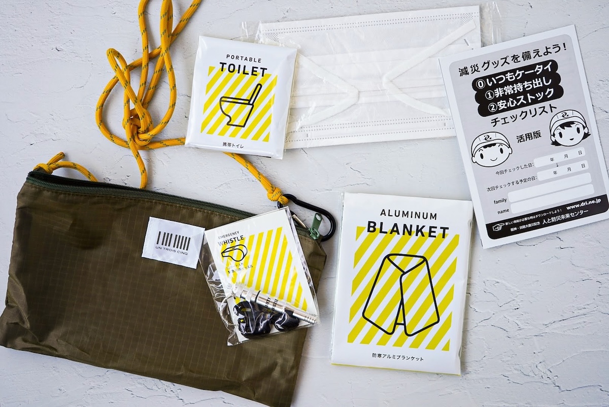 サコッシュの肩紐は光を反射し暗い場所でも目立ち、取り外してロープとしても活用できる優れもの。防寒アルシートや携帯トイレ、ホイッスル、マスク(大人用)など非常時に必要なものがコンパクトに入っていて安心です。