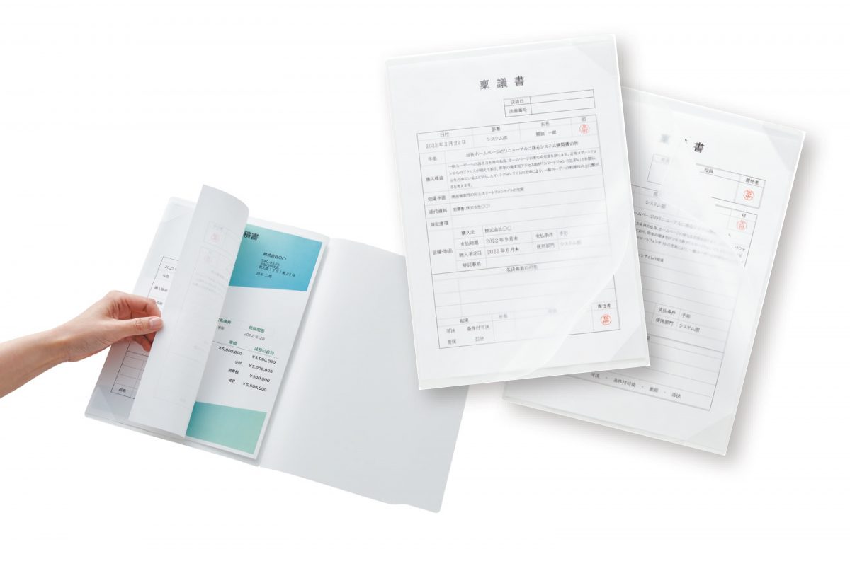 検印欄がどの位置にあってもカバーをめくるだけで簡単に押印できる書類ホルダー。2か所に付けられた三角形のストッパーが、書類の脱落を防ぐとともに、書類をめくりながらの閲覧を可能にしている。