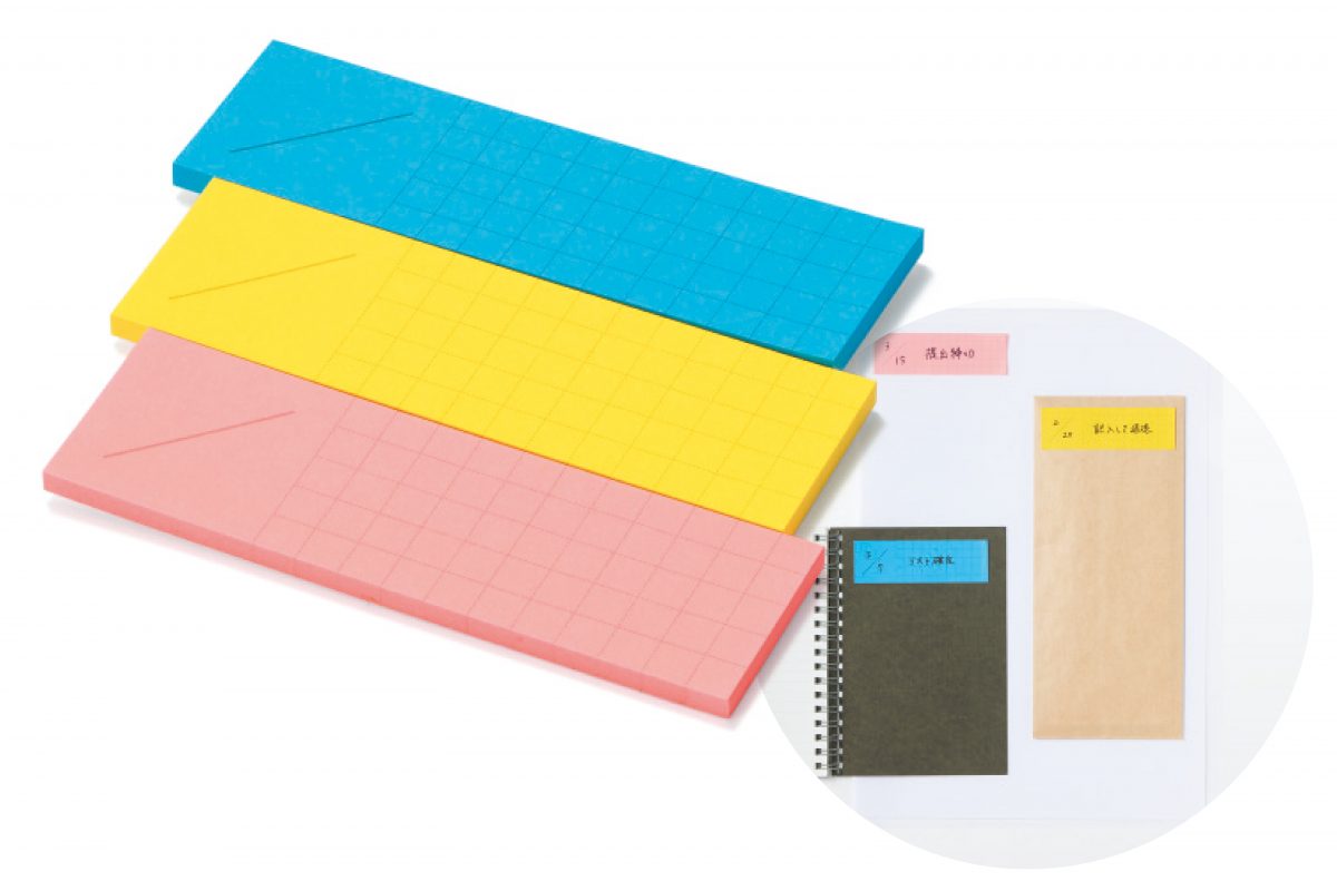 日付欄があり〆切の管理などにも使える付箋。ウラ側のほぼ全面にのりが付いており、貼り付けた際にピラピラせず剥がれにくい。メモ欄は文字を真っ直ぐ書き込める方眼罫入り。色が鮮やかでよく目立つ。