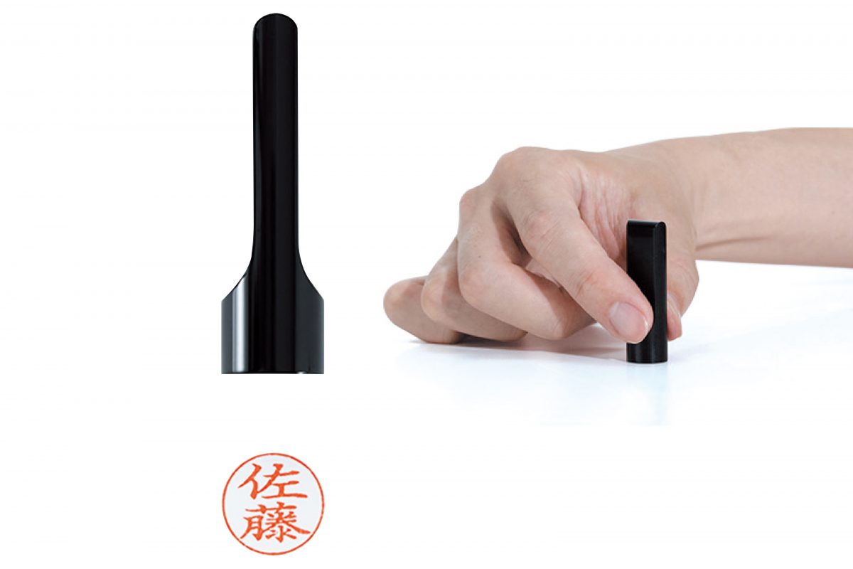 持ち手に“くびれ”を設けたはんこ。印影の傾き調整がしやすく、支点が下がったことでズレにくく、安定してきれいに押せる。傾斜が指にフィットし、下方向に力を込めやすい。専用ケース付き。