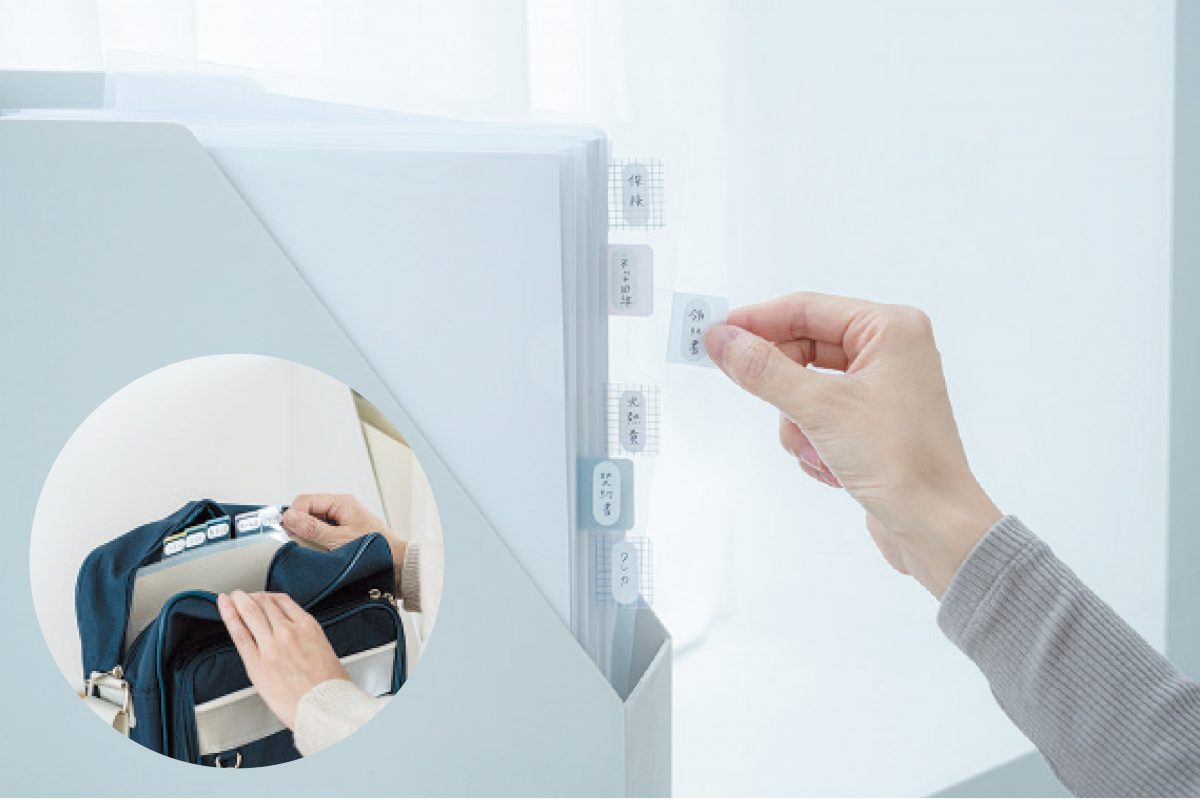 クリアファイルに貼ることで書類を見つけやすくするインデックス。丈夫なプラスチック製で、つまんで引っ張って書類を引き出せるタブとしても機能する。部屋やオフィスに馴染む透け感のあるデザイン。