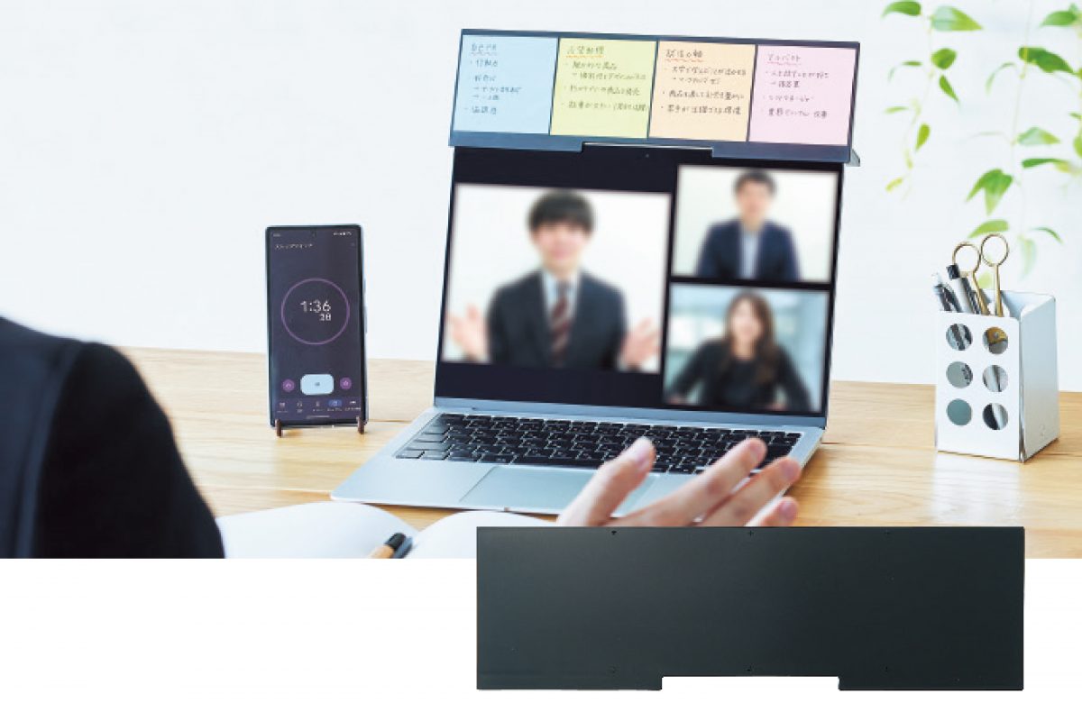 ノートPCの上部に付箋を貼るスペースを確保できるボード。オンライン会議や面接などの要点を書いた付箋を貼れば、カメラ目線のまま内容をチェックできる。設置はストッパーをPCに引っ掛けるだけ。