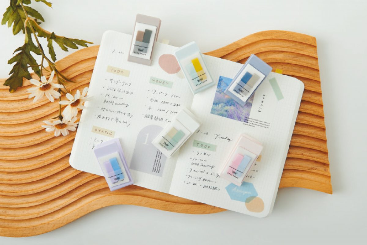 メモパッドのように綴じられた剥離紙付きのシート型マステ。横にミシン目が4本入っており、好みの太さにカットできる。剥離紙の一部だけを剥がして、付箋のようにも使用可能。水性ペンでも書き込める。