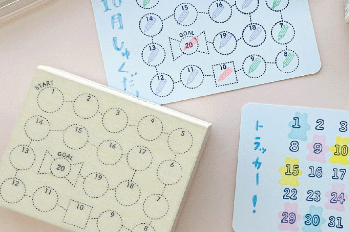 押すだけでスタンプカードを作れるハンコ。スタンプカードのマスに、小さなスタンプを押したりシールを貼ったりして使う。勉強したらスタンプ1個などのルールを設ければ子どものやる気がアップ!